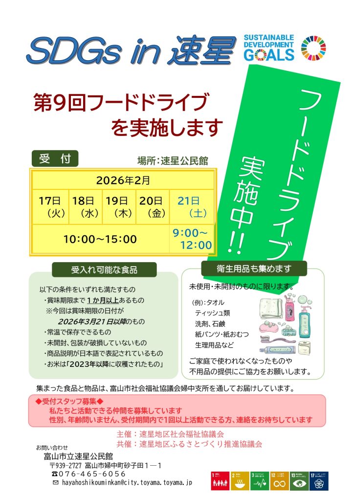 速星公民館(富山市婦中町)でフードドライブが開催されます! 富山市立速星公民館2026年2月17日(火)~20日(金)10:00~15:00、2月21日(土)9:00~12:00実施者 速星地区社会福祉協議会、速星地区ふるさとづくり推進協議会 2026.01.23 速星公民館でフードドライブが開催されます! 寄付いただける食品・衛生用品がありましたら、ぜひお持ちください! 詳しくは、以下のチラシをご覧ください。 この記事をシェアする Tweet 前の記事富山県消費者協会でフードドライブが開催されました!